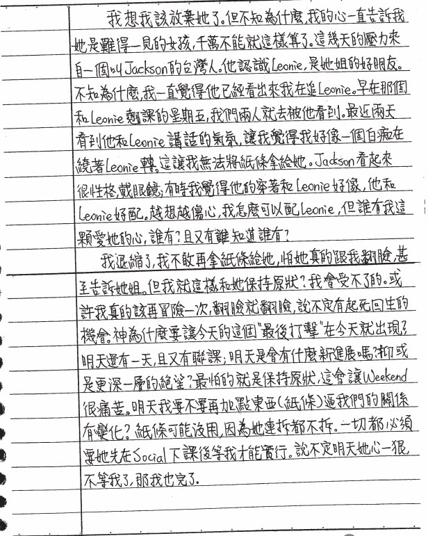 今天還是繼續著塞Leonie紙條一事,這個一直塞不過去的紙條,寫什麼呢?之前你打算寫的是「為什麼你不理我」,現在,你打算寫的內容改變了,你變成在約她,早一點來Chemistry教室,卻又不說到底要什麼?我在想,乾脆就直接約一起吃午餐就好了,為什麼要一直約早點在教室講事情、放學留下來講事情,卻都不講要說什麼,後面還加了一句算是很經典的「如果妳覺得我很煩,妳也可以不要來」,這真的是會讓女生覺得很白目的。