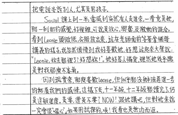 甚至我在想,她姐姐是否並非她姐姐,而是「重組家庭」的,但這樣的「重組家庭」的大人之間就不容易有衝突,不至於造成她一直翹課不來上學。你這裡還有形容她的外貌──「頭微低,衣服放出來(襯衫不扎進去而放出來在外面,算是當時還算流行)」,看到這個「標準Leonie」的樣子,你終於又寫出心聲:「我忽然領悟到我仍然好喜歡她……雖然她幾乎總是我這麼不客氣。」