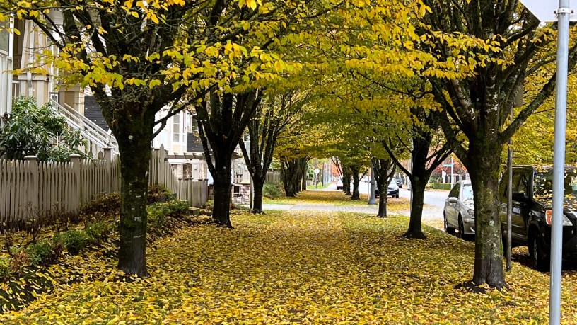家門口的葉子從黃色漸漸轉成紅色,還沒完全紅,還在深黃色的色系裡。這是我們第一年認識它,原來掉下來之前,還會先轉成紅色啊?社區外的樹就更誇張了,整個人行道地上已經落滿了黃色的葉子,奇怪的是,都掉了這麼多葉子,頭上的黃葉竟然還是非常茂密,所以造成了──天上一片黃,地上也一片黃,全部都是黃色的、完全沒有任何縫隙的驚人美景。