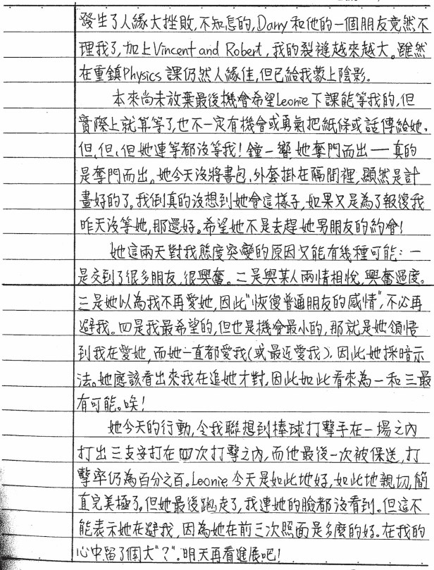 今天你又寫了三倍份量的超爆多日記,我還來不及細讀,但看到你的心情標註是「D」就知道大概不是很愉悅的原因在促使你今天寫這麼多字,是嗎?這一天,早上,你肩膀被興奮的Leonie用力拍了一下,轉過頭看到她,她還「臉上堆滿笑容」、「親切得令你無法想像」,你將這個笑容比擬到當初讓你「一見鍾情」的那個笑容,「上次那個笑容,讓你整整瘋狂了兩個月之久」,真的……哎。