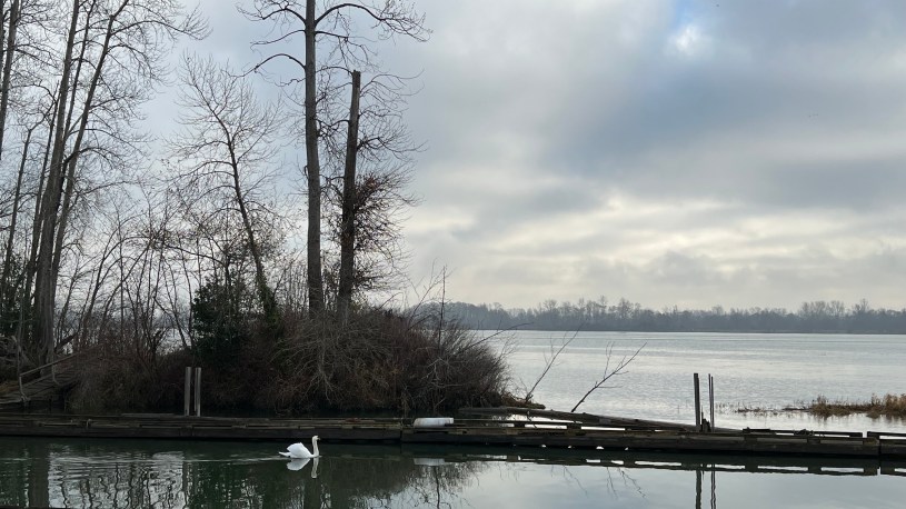 今天到Dyke河堤畔的水上人家拍兩支「今日頭條知識」,有一隻大白鵝優雅滑行經過那條由違章建築蓋成的運河,至出河口再緩緩游回。然後我們就回家準備了。