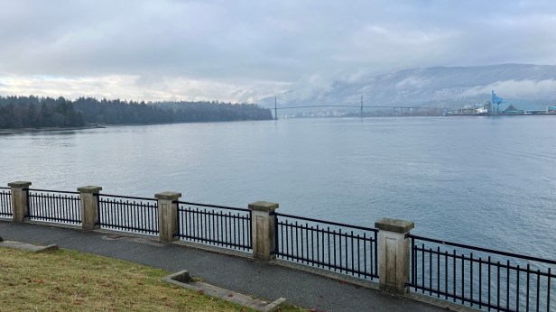 然後我們到上次很冷的那個北部公園旁邊享用了這一餐,垃圾就近在旁邊垃圾筒丟掉,我們繼續往市中心裡面開,逛逛,又經過上次的海邊,哥哥很開心,哥哥說,他喜歡兜風,妹妹本來醒著,當我們開進史丹利公園,她已經又睡著了,我們到旁邊幫孩子們買了一杯巧克力和一塊餅乾,看到遠方山壁上的綠樹林的樹頭上,結了一層白色的霜,陽光照在上面,看起來以為是雲朵,我們繞了公園一圈,再開1小時慢慢地回家。哥哥靜靜的看窗外,妹妹又在睡了。