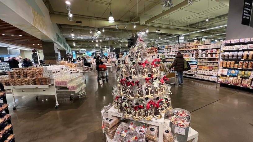 天氣陰陰雨雨的要去哪裡呢?我們來到Whole Foods,小朋友們一人50元加幣預算,讓他們買自己喜歡的聖誕節食物,不來還真的不知道,哇塞,真是超好玩的,超大的薑餅人,整隻淋上黑巧克力和各彩裝飾的聖誕老公公,各種的餅乾、糖果……都精巧的裝飾成聖誕節,圍上了紅色或綠色的絲巾,再加上強力的燈光照射下,每個都好想買喔!