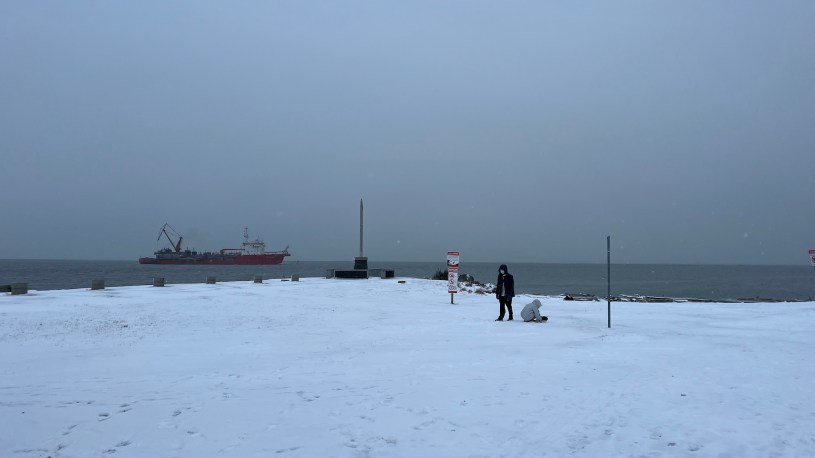 但孩子找不到,跑哪裡去玩了?一片都是白茫茫的雪,有些人在走路,但大地更大,這時候天上居然偶爾仍有雪鵝成群結隊飛過低空還大聲的呱呱叫,孩子們,我打電話也不接,我開始緊張了,會不會他們在哪昏倒了。我試著往海邊走,終於看到在西南角,我們家兩個孩子正在那邊堆雪人啊,而他們的後方,是深灰色的惡水(海水),居然有非常大的船隻,在背景經過,一艘先往右,過去之後,另外一艘更大的往左,緩緩移動的巨輪,很特別的風景,照相機卻怎麼拍都拍不下,都無法拍出巨輪的大、海水的險惡、滿地的潔白以及兩個孩子安靜無聲開心認真的堆雪人的樣子。勸他們別堆了,這裡堆不大,走幾步路,妹妹說,沒在堆雪人的時候突然開始冷了,四個人連忙回到車上。一刻都不敢停。