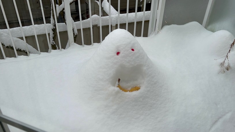 早上與妹妹再玩了一次「盲人遊戲」,然後,在兒子的提醒下,將後陽台那個「雪人」的「嘴」(我丟一根香蕉在上面)拿進屋內了,這根香蕉被零下10度凍過,是比冰箱上層的冷凍庫還低溫的,已經整個成硬棒,無法剝皮,剝一點即脆斷,只好將其裝在銀碗內,放在暖氣孔旁邊。