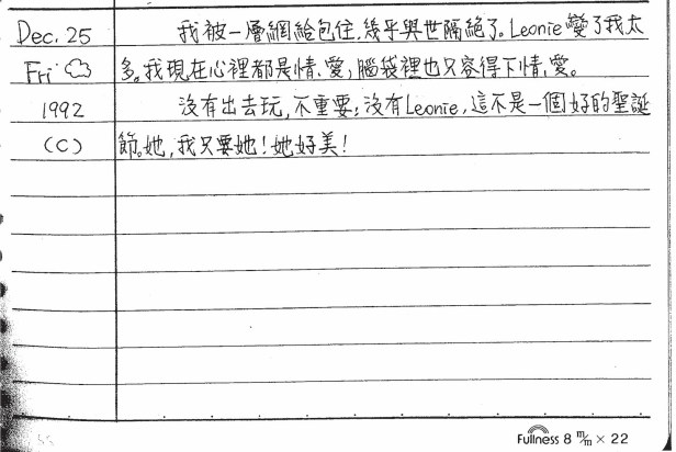 耶誕節,就算在30年前,沒有LINE、FB Messenger、WhatsApp、Signal…傳來的訊息,也沒有簡訊,應該也是充滿愛與關懷與祝福的節日,但你並沒有寫下這一天你如何與家人過的,你只寫了四行字,算是被愛情淹沒前的求救嗎?你說,你現在心裡都是情、愛,腦袋裡也只容得下情、愛。你形容你「被一層網包住,幾乎與世隔絕」,不知道是什麼意思呢?