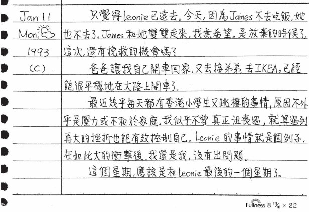 然後你很難得的第一次在這份還寫不到一年的日記中提到「時事」,你說,「最近幾乎每天都有香港小學生又跳樓的事情,原因不外乎是壓力或不和於家庭。」這樣的事情,到了今天(2023年),在台灣也依然一直發生中,每次發生,就可能是新聞頭條,不過此時16歲的你,很難得的分享你自己家庭與成長的「觀感」──你自認自己離那種「不爽就跳樓」是非常非常遠的,你稱自己「似乎不曾真正沮喪過,就算遇到再大的挫折,也能有效控制自己」,這實在很重要也很有趣,回想起來,在你16歲時,似是如此沒錯。你還舉Leonie為例,在如此大的衝擊,你自認並沒有出問題。