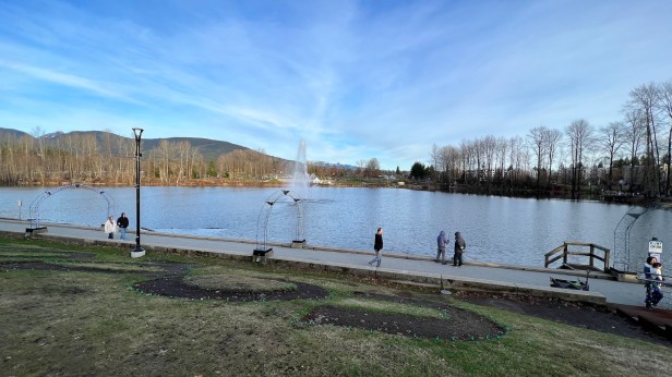 創一紀錄是我們竟然一樣東西都沒有買,推著空的籃車,從出口往回推,上樓,一路推回入口,孩子們試坐了各種辦公椅子,都說不夠好,哥哥求質感,顏色不能醜,連那種300元加幣的最好坐的辦公椅他都不行。後來我們連退貨的衣架都沒貨了,空手回。這樣太快,就到朋友介紹的高貴林的Lake Lafrage,發現就在熱鬧城市旁邊,很多人在繞圈,有兩攤流動車子賣吃的,樹邊綁上了各種聖誕燈,顯然是為了孩子而設計。不過我們家孩子照例留在車上玩「橫的」。哥哥手機沒電了,哥哥玩妹妹手機,妹妹在旁邊看。我們繞湖一圈,帶一包12入的迷你甜甜圈給孩子們嘗鮮。