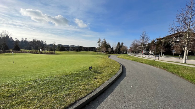 但,眼睛一轉,又看到了利用這裡天然美景所搭出來的更驚人的風景,好吧,亞洲也蓋不出這麼誇張的風景。這是一座高爾夫球場,果嶺的草已嫩鮮綠到……沒有形容詞可確切形容它的美,人類在上面打球,好像在天堂;右手邊一大片的公寓,左手邊則一大片的獨立屋,我又開始判斷這些屋子長得都一樣,所以應該是共同住屋strata,看起來每家有自己院子和房子,但只有整片產權的幾分之幾,自己沒有更動權。好隊友認為這樣也好,除草、清雪都有人幫忙,不必自己做。