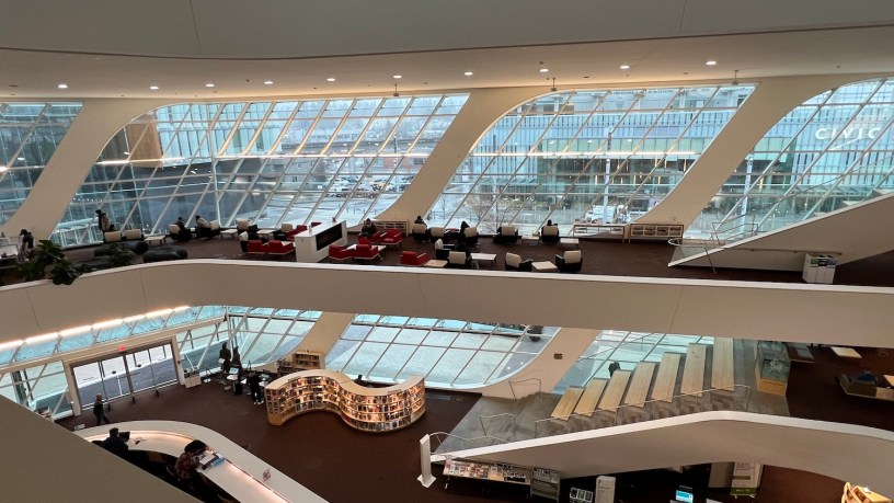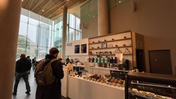 今天好隊友幫我們安排到Surrey,喬治國王道這裡的「Surrey Central」,我們很幸運在路邊找到車位,可以看得出,這裡有些皮膚比較黑的人,搖搖晃晃地走在路邊,果然是全溫哥華治安最差的衛星城市的市中心,但他們好像又沒對人有任何威脅;這裡建起了非常新潮的大樓,又高,又非常的寬,好像「斜體字」的玻璃的圖書館,還有這一間大概有兩三層挑高的Prado咖啡,我們坐在10公分厚的大窗邊,覺得安全,雖然排隊時有另一個帶著狗的毛衣人就這樣子直接插我們隊,我不敢吭,在他後面重新排隊,店員不知道在講什麼,去廁所的鑰匙只有一隻,美麗的硬體,但軟體顯然還是Surrey,但這裡可是有一間私立大學KPU和公立的SFU。