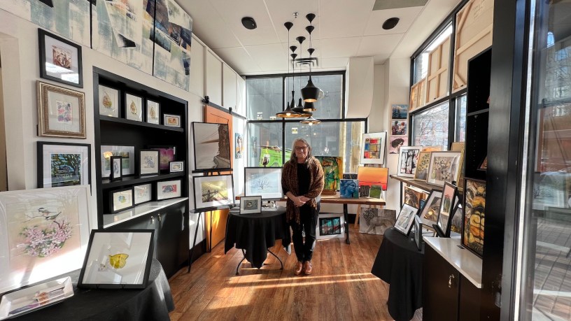 走到角落,真有一個Art gallery,進去一看原來是pizza店改裝的,有趣的是那些畫作都是賣差不多的價錢,都是$495加幣這種的,其實不便宜,我就開始好奇問這位大媽,原來,她本人就是畫家,這間pizza店是她老公的。比方說一張畫「吊橋下」,$495小小的明信片的轉印的,比較大的油畫也是印的,700多元,她說原始畫作她會賣1400或1700加幣,這些價格也怪怪的,可見不專業,不過這位70幾歲的大媽看到我如此感興趣,就與我聊更多,這家義大利披薩已50幾年,原本在山腰上,幾年前這裡新蓋才搬到此角落,現在整個店面與房子一起賣,她說,既然你這麼有興趣,就給我房仲的電話。