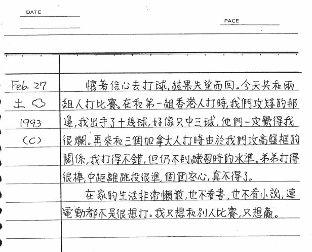你心裡其實是非常有競爭慾的,所以等了幾天就是為了期待打球的這一天,至於其他事,就不是很在意。不過,也想在學業上成功的你,自評了自己現在的生活,「在家的生活非常懶散」。為什麼呢?你說,「不看書,也不看小說」。呵,我覺得很有意思,這不就是我現在兒子、女兒的心情嗎?我們大人常和他們勸說多看點英文小說、看英文報紙……他們似是認同但就是動不起來,看來16歲的孩子都是這樣子吧?
