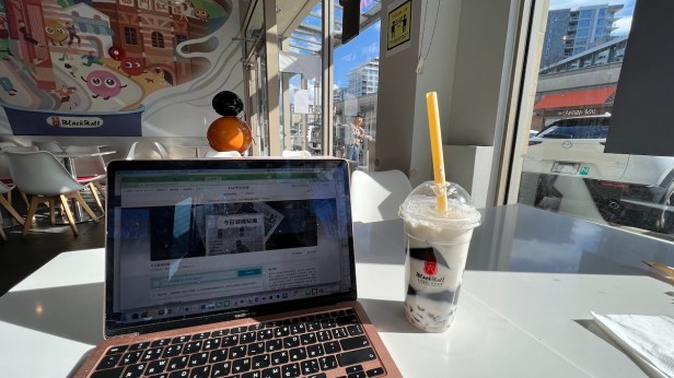 好隊友來這裡咖啡廳與朋友聊天,我很難得的獨自至黑丸嫩鮮草。陽光實在媚麗,店員問我會不會太熱,我趕快說千萬不要拉窗簾。我太渴著要「喝」陽光了,喝完了飲料就喝陽光,這裡滿滿是人,我戴兩層口罩,旁邊兩桌很難得的是韓國人與日本人各一桌,全是女性,各自講韓語與日語非常大聲。
