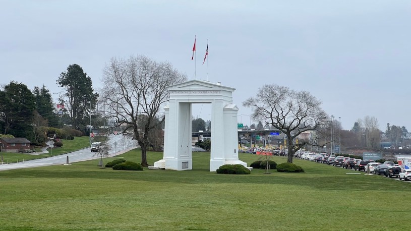 今天我們真的「去美國」!Well,或許有很多理由,不必非得今天順著兒子之願,帶大家去美國,但推動我的是,我希望和孩子再更多一點點的親密感(儘管已很親密),他們真的快長大、快飛走了,兒子只有在同車出遊才較願聊天。我們先加油,買麥當勞當早午餐,天上飄著雨,時大時小,這次,我們護照都帶好,無懸念,直直往南走,邊界是一個叫Peace Arch的紀念碑,這地方我年輕到現在至少經過了十次以上,但每一次都像第一次看到;兒子下車,跨過整個草地去上旁邊的洗手間。車子慢慢的往前。