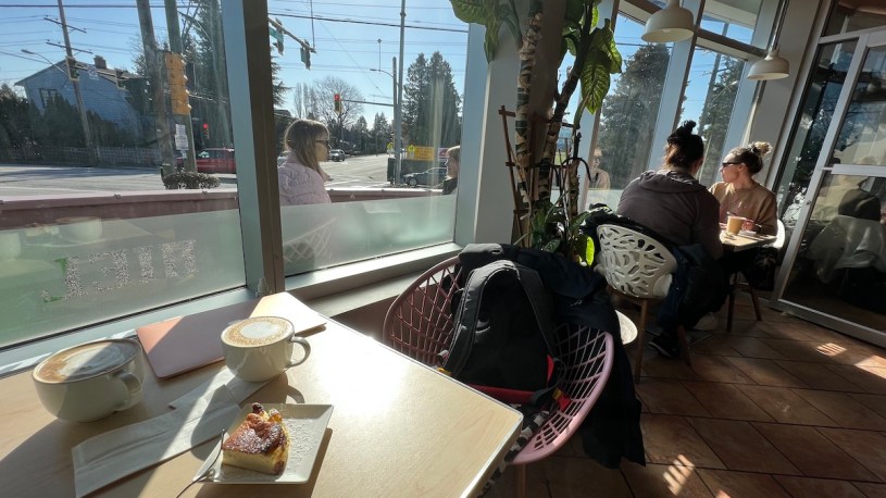 今天的咖啡館是河流內陸邊老城New Westminster的Hiel,停地下停車場,跟著來看醫生的老人上樓,坐在陽光下,再到對面的印度平價餐廳Tasty Planet吃了Naan配咖哩,那個素雞肉蠻好吃,和台灣人吃素肉不一樣。印度老闆兩度來我們桌邊關心「一切都好吃嗎」。我們來到這老城市後面走一圈,這個城市的住宅區小路比較雜亂一點,其中一棟獨立屋還有做美甲服務,有的屋子把小小的前院草皮都填成了水泥與石板。我們看到一間在地下室的肉舖,有點像兇殺現場,我跟這位夫妻買兩個藍莓派,出來才發現旁邊有另一家專門賣派的,五個冰櫃都是派。