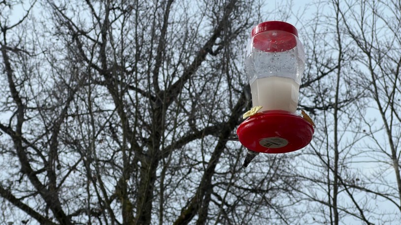 好隊友發現我們蜂鳥餵食器裡的水飄著一絲固體,應該是發霉了,我兩手都戴塑膠手套,打開它,果然底層幾處是黑的,為了讓我們蜂鳥朋友更健康的,我們趕快換水。兒子之前一再提醒千萬不能把鳥喝過的東西倒在廚房(此處他很細心),所以我決定在「馬桶」裡面洗這個,沖了五次;我不敢再放外面曬乾,怕蜂鳥找不到食物,以後就不來了,所以把它洗個乾淨,再為它加新的飲用水與糖泡的糖水,趕快就掛回去了。才剛掛回去十分鐘,我們的蜂鳥又來吃了。所以應該是OK的。