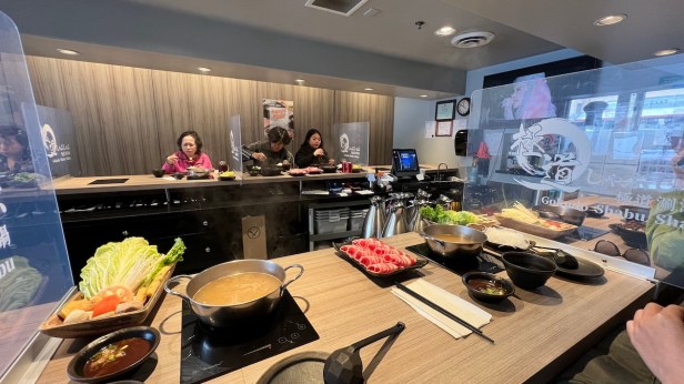 想做某種「慶祝」,帶好隊友去吃這裡的台灣涮涮鍋「極道」,一個鍋要20至30加幣中間,大約台幣500元,長相與台灣差不多,高腳椅,桌繞半圈,老闆從中間區域上菜,火鍋店在台灣是出名的「好開」的,只要準備生料,但這裡大概沒看過這種店,30年前我住這也沒有。來這裡的竟沒有一桌是台灣人,都是ABC、上班族女、還有老外都來了。它的沙茶醬料調得特好吃,湯頭太淡,料蠻多,是吃得過癮的,夾在好多器材中間的大電視不間斷播放五月天的演唱會,各種名人來賓來參加合唱。