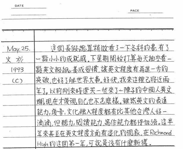 這一天你難得的「回顧」,你說你來溫哥華已經「將近兩年」,你是在1991年的8月29日抵達溫哥華,你很懊悔的回顧,你剛來時還曾經笑一些人來了兩年但「英文爛」,但現在你自己也來了兩年才發現「自己也不怎麼樣」。你和其他也來到溫哥華的台灣同學相比,的確比他們強了不少,你列出「表達能力、發音、文化融入程度」都「好一滴滴」,而你需要加強的部份則包括「聽力、閱讀能力、寫作能力」。寫得非常清楚。我要把這些給30年後我家兩個孩子參考一下,哦,不,不要,因為我若給他們看,他們頂多變成跟我一樣;有我的前例,雖然他們和我同期來,但有機會比我還棒的。