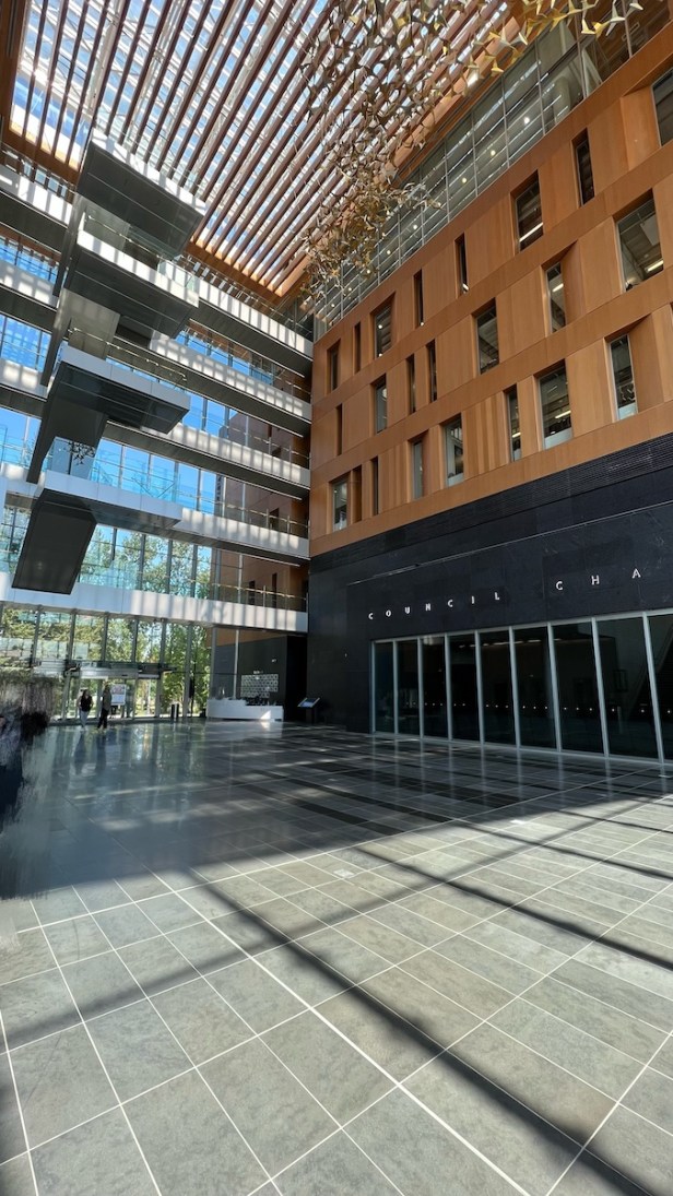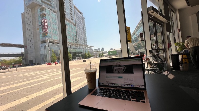 我們今天原本要去Surrey圖書館,但圖書館已坐過兩次,所以我們來嚐新,旁邊Surrey市政府,有點像台中市政府那種玻璃建築,只是更高、更大、陽光穿透玻璃也更媚。旁邊的Take Five咖啡,很幸運坐到它最窗邊的座位,第一次來,就覺得這個位子比遠比圖書館裡面好,落地大窗,不是90度而是大概60度,所以我左側、前方全是玻璃,透過玻璃看出去是大廣場,好像我坐在大廣場的玻璃櫃裡。來市政府辦公的市民,有印度老阿公,有看起來講話很嗆的華人……服務員是一位看起來像東南亞菲律賓來的、長得像男生的女生。