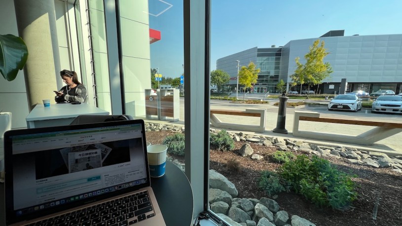 這個像體育館的車廠,大沙發小沙發,在新車展覽區的周圍。以前小時候在溫哥華,送車子來保養,就是來到一片黑油味兒、橡皮輪胎味兒,現代的車廠真是好舒適喔。早上八點多就坐在超大的窗邊面對我的電腦了,對面的另一間保時捷車廠是我的人生目標了。我抓了免費的拿鐵,加了冰水,卻坐一個小時,才進入狀況。