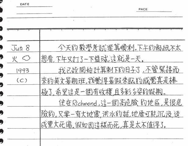 這一天你第一次在日記裡提到Richmond這個沙洲城市「高危險」,因為當時有一段時間本地的報章媒體無論中文英文都在說北美西岸會有九級大地震,便會造成海嘯,然後沙洲城市一定會大災害,「地層可能沉沒」是你所收到的訊息,此時你對這件事的看法是「假如因這樣而死,真是太不值得了」。