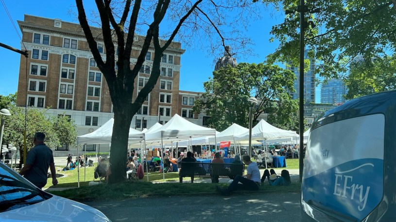 在週末這一天,好像週間孩子去上學的日子一樣,因為他們去做VIVA志工了,地點在溫哥華市中心,治安不太好的、歷史悠久的Victory Square。他們清晨就走到隔壁,去搭「骨碎同學」的家車,兒子不讓我載呵。我們輕鬆的中午去吃個極道涮涮鍋,隨後也北上進入市中心的Victory Square旁邊偷偷看看這場活動,活動比我們猜想的熱鬧,好多大白色的大帳棚;車繞到第二圈,真的看到了我家孩子們,就坐在其中一個白色帳棚下,哥哥妹妹坐一起,旁邊還有一個女同學,大家都看著手機;哥哥臉上已無口罩。雖然兩位都看手機但卻不回我們的訊息,唉……他們說要自己搭車回來,因為那個S同學可能要吃火鍋、有些坐車車位安排的糾結。我和好隊友就來到East Side的Science World附近新興區,這裡又一間陽光充沛的Honolulu Coffee。