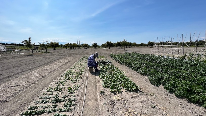 下午一點到學校載孩子們放學,接到妹妹,我們極道涮涮鍋,今天陽光此時有點太炎熱,車上無法久待,必須怠速,妹妹在車上等,我與好隊友繞廣場走了一兩圈,在冷氣車中看著外面的陽光下的景致真是非常美麗,往南,到3號路底,住著一個台灣阿伯,鐵鍊打開,表示他人在;阿伯正在倉庫,跟我們細數他今天有青江菜、小白菜、花椰,結果,他拿起一把小鐮刀,原來以上的菜都還沒摘呢!我們跟著,在他允許下我們拍了也錄影了這難得的體驗,看到阿伯坐在木矮凳慢慢的割下,還說不連根拔起以免塵土飛揚不乾淨,才發現這塊菜圃好像樣品,地面都平整且乾乾爽爽,若在東亞的鄉下一定是蚊蟲齊飛又多潮濕窪地吧。這麼多菜,阿伯算,竟只要13.5元加幣,我們原本是拿50元加幣大鈔呢。