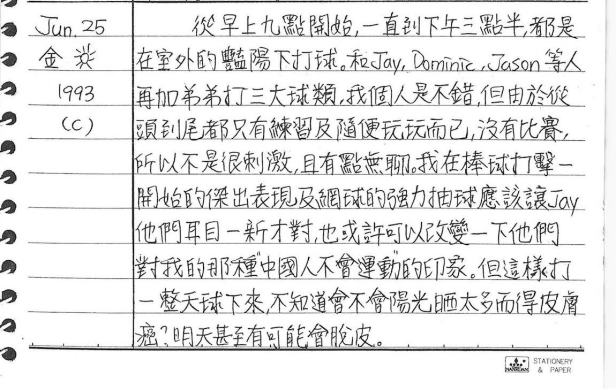 這一天你第一次寫出了運動的時間,原來是這麼長的時間!「從早上9點開始,一直到下午3點半,都在室外的豔陽下打球」。這就是16歲的少年的體力啊!和誰呢?找了印尼朋友Jay,老實的戴著眼鏡的總是很亢奮的香港同學Dominic,以及Jason(我忘了是誰)等人,還有我家弟弟,打了三大球類,大概就是棒球、網球、籃球。