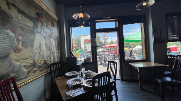 回到車上,孩子和好隊友都累了,我自帶了兩盒切好的瓜,妹妹吃了一些。我們往下一站吃飯,轉角的一間每次必經過的、Google評分4.3的叫Sharkey’s的美式海鮮炸魚餐廳,這應該是一棟很有歷史的木屋,弄成bar,黑壓壓的看不出舊。房子的旁邊似乎可捕魚的,也有直接下水的小碼頭,有人就直接抬兩條獨木舟直接滑出去了。有一個華人叫Chung這邊賣sockeye鮭魚,我們被安排在窗邊的木平台上,牆壁上的壁畫是水手在甲板上手拿咖啡杯,他們說廚房有點忙,等了蠻久,所以我盯著這壁畫很久很久,而其他三人大多時間在看自己手機。