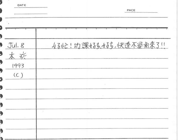 這一天你再次什麼也沒提到,只提到「功課好多好多」,指的應該就是English 11暑期班的作業。30年後的今天我和高中同學聊,才知道他在當時,也就是你fail英文並去補修暑期班的同時,這位朋友的英文竟然平時成績還拿到「A」,可見並不是不可能。而在這個暑假,看來你好像雖忙但應付的不錯,成績可能蠻高的(見後面日記)。