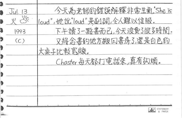 在這一天,你還抱怨一件事──你覺得香港同學「每天都打電話來」,「真有夠煩」。那時候沒有任何通訊軟體,沒有email,沒有網路,所以同學間只能用電話,而這位很有緣份的香港好同學,可能這段時間很多問題要問吧?你直接評語「真有夠煩」,你快受不了了。