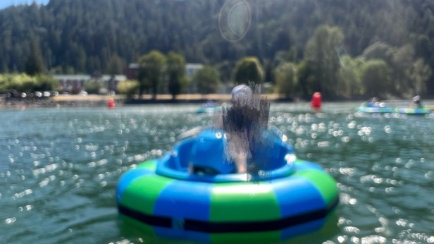 兩小時後我們才下船,在船上一樓的室內小餐廳(四桌座位)沙拉wrap當午餐,還有萊姆調酒,回房間換泳裝,來玩下一個Bumpy Boat碰碰船。原來,真正的自然之平靜,除了清風、空氣、風景,若還能加上水流,加上圓形的氣墊船身左右搖晃,水流又讓人一直有往前流的錯覺,看到相對位置卻發現位置沒變;有時候用力撞向水上柱,撞完後發現還是原地不動,一種昏眩感,好像麻醉於現實日子外了。