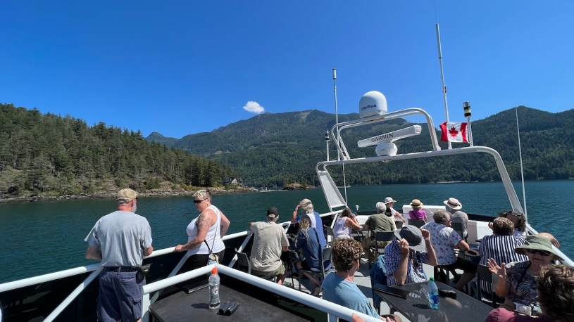 我們參加Shoreline Tours大遊艇遊湖,若要將這個狹長的Harrison湖搭船到底,竟需要五個小時,比從台北開車到高雄還久,經過一個湖中小島「回聲島」Echo Island,這島上大概十幾間房子,沒有路可到,只有船,可是仍發現還是有人在上面建了很大的房子,上面鋪滿太陽能板,碼頭旁邊還放兩張加拿大椅,就是要讓人羨慕的吧?雖然水邊有房,但房的背後的整個回聲島的內陸卻是毫無開發的,這不是恐怖電影的主題嗎?他們說這些房子冬天不住人,不是因為冷,而是勁風。船再往前,這段的岸邊看起像熱鬧的城鎮,一排都是比鄰而居的房子,其實也是在沒有正式道路可通的某個半島上。
