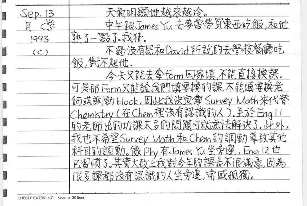以下是30年前的今天(1993年9月13日)當時16歲的我所親筆寫下的日記: