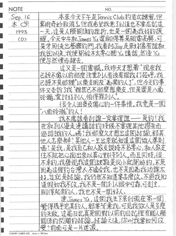 以下是30年前的今天(1993年9月16日)當時16歲的我所親筆寫下的日記: