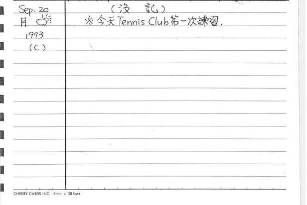 這一天,當年16歲的我「沒記」,卻是一個大日子──期待已久的網球社團,第一次練習,也就是第一次和一群陌生的球員一起打球,有些是很強的,全部都是西人。我打得如何?忘記了,或許明天的日記會再提到一點吧。