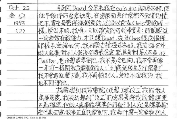 以下是30年前的今天(1993年10月22日)當時16歲的我所親筆寫下的日記: