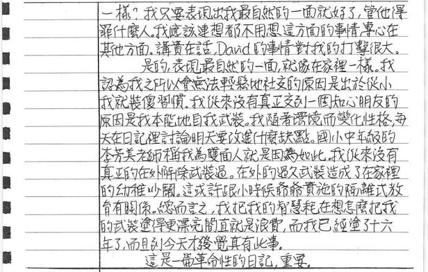 我的方向是對的,我也從這篇「革命性的日記」之後,斷斷續續做了很多努力,不管別人怎麼想;我的確變得比較善言,比較大方,比較敢闖蕩,但,核心裡,我仍然很怕事。心裡卻住著一個強悍者,不願懦弱終生。