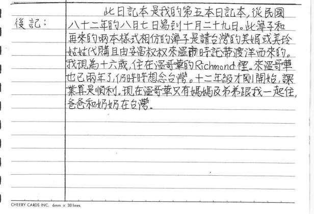這一天我為過去這本日記簿做個總結,三個月左右的日記,是我的第五本日記本,它是親戚幫我代買並送過來的。這時候的我在做總結時,當然不知道我的未來是如何,當時我只是一個12年級的16歲的學生,明年就要上大學,可以上到哪間大學我都還不知道,或許科系也都還不知道,但我字裡行間是一種沉穩的氣息。