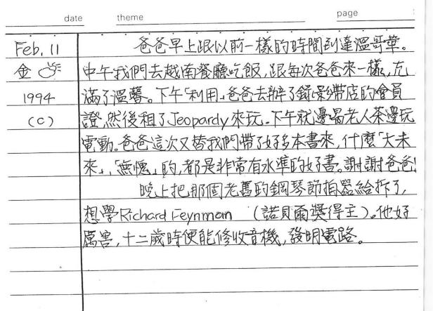以下是30年前的今天(1994年2月11日)當時17歲的我所親筆寫下的日記: