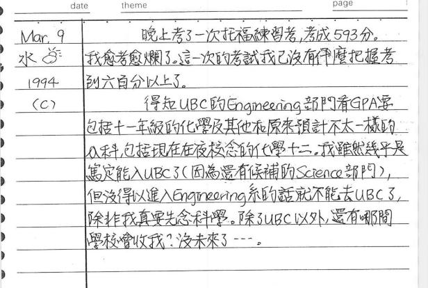 以下是30年前的今天(1994年3月9日)當時17歲的我所親筆寫下的日記: