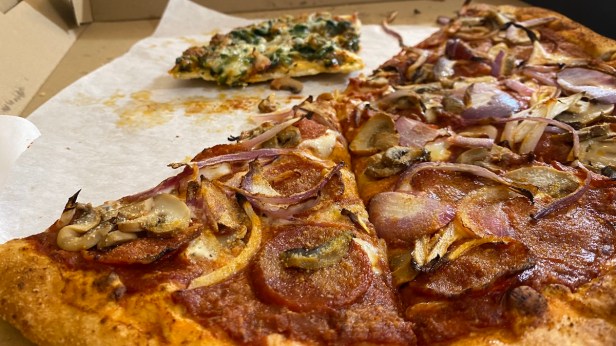 晚餐叫pizza,FreshSlice正在搞BOGO(買一送一),更棒的是最挑剔不愛pizza的哥哥竟說這次好好吃,以後我們可望一起享用pizza了。他們吃新鮮的,我則自己用大烤箱烤了一塊冷凍素食pizza,吃掉四分之三,極為飽爽。