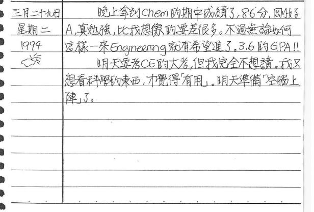 以下是30年前的今天(1994年3月29日)當時17歲的我所親筆寫下的日記: