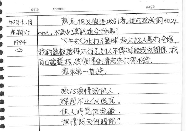 這一天的日記相當特別,因為我寫了一首七言詩,來感歎我欣賞的這位在英文課同班的「佳人」,我「想走但又被她吸引著」,明明不知道這人適不適合,我還是被她吸引著,都揮汗打了全場籃球、累乎乎的回家,還能寫詩呢!