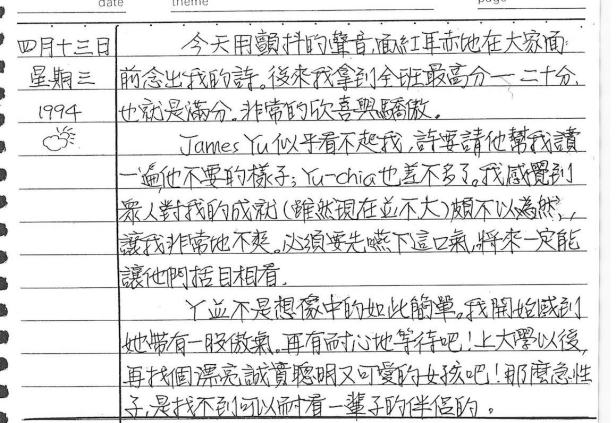 以下是30年前的今天(1994年4月13日)當時17歲的我所親筆寫下的日記: