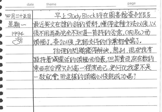 以下是30年前的今天(1994年4月25日)當時17歲的我所親筆寫下的日記: