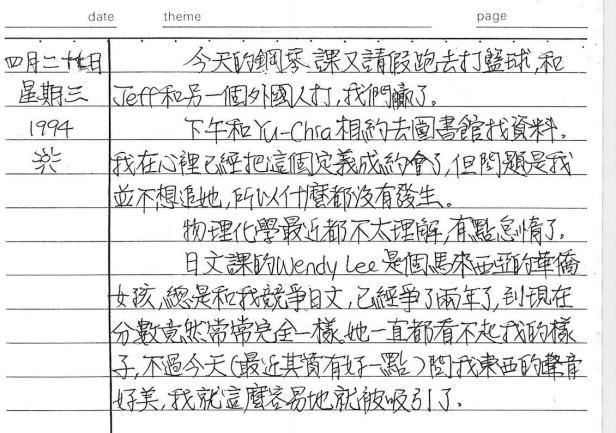 以下是30年前的今天(1994年4月27日)當時17歲的我所親筆寫下的日記: