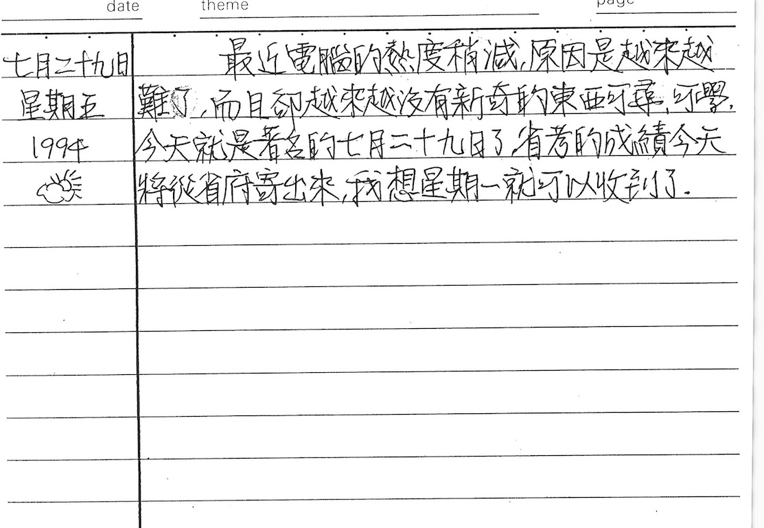 以下是30年前的今天(1994年7月29日)當時17歲的我所親筆寫下的日記: