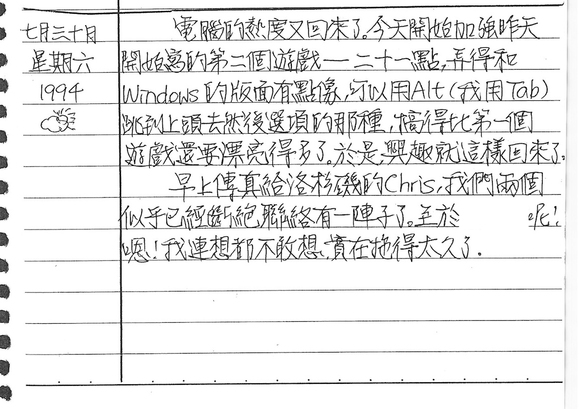 以下是30年前的今天(1994年7月30日)當時17歲的我所親筆寫下的日記: