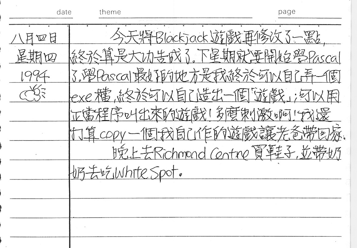 以下是30年前的今天(1994年8月4日)當時17歲的我所親筆寫下的日記: